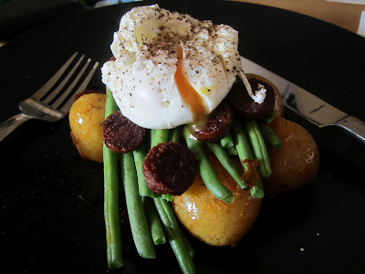 A bit more time, a bit more heat, a bit more Spanish flavouring: Chorizo, Potatoes and Green Beans with a Poached Egg is today's dinner. I parboil new potatoes until tender before draining and cutting in half and for the final few minutes while they cooking I steam the green beans above them. Meanwhile, I cook the sliced chorizo until it gives up it's fat before adding the halved potatoes and stirring it together. I plate up the potatoes, pile the green beans on top and put a poached egg at the peak of the food mountain and break the yolk so it spills through the beans, potatoes and chorizo down to the black plate. I really like the creaminess of the egg with the nutiness of the potatoes and crunchy spice of the chorizo in this dish. The addition of the beans gives it a welcome freshness.